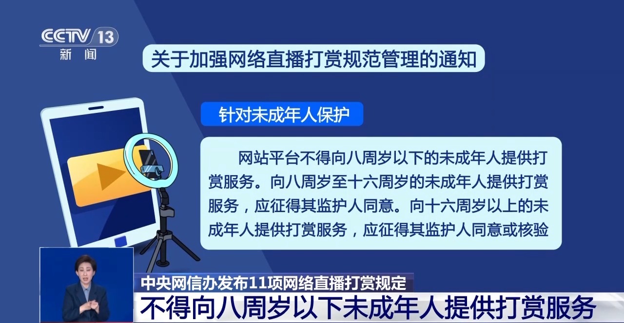 據(jù)記者了解,“通知”中提出11項(xiàng)具體要求,包括:明示打賞規(guī)則、規(guī)范打賞營利權(quán)限開通、完善未成年人保護(hù)機(jī)制、建立打賞營利行為負(fù)面清單、加大處置和曝光力度等。
