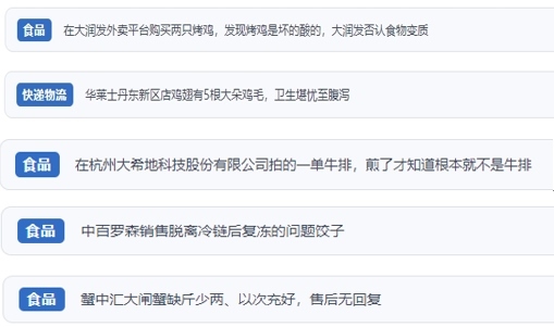 “人民投訴”上不少網(wǎng)友反映,“外賣商家銷售排骨套餐中含過期飲料”“外賣店鋪吃出蟑螂,商家不按照食品安全法賠償” “直播間購買車厘子,虛假宣傳3J、原裝進口,到貨嚴重貨不對板”“網(wǎng)購東北珍珠貢米,到貨包裝上執(zhí)行標準是廢止的標準”“超市買的梅花肉切開發(fā)現(xiàn)是淋巴肉”“平臺商家承諾枸杞不熏硫酸,實則檢測后含硫超標”“知名便利店售賣脫離冷鏈后多次復凍的餃子”等。