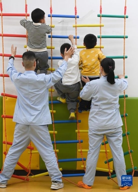 3月30日,在西安市金色陽光康復(fù)中心,孩子們?cè)谔亟汤蠋煹谋Wo(hù)下進(jìn)行康復(fù)訓(xùn)練。