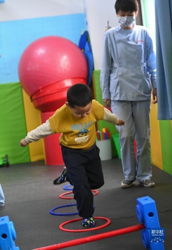 3月30日,在西安市金色陽光康復(fù)中心,特教老師為孩子進(jìn)行康復(fù)訓(xùn)練。
