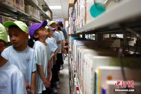 圖為一個(gè)藏族女孩抬頭望向書架。 中新社記者 富田 攝