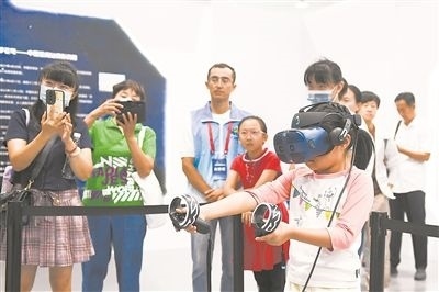 9月17日,在全國科普日北京主場活動(dòng)展區(qū),小朋友使用虛擬現(xiàn)實(shí)設(shè)備感受天和核心艙內(nèi)的生活。新華社記者 鞠煥宗攝