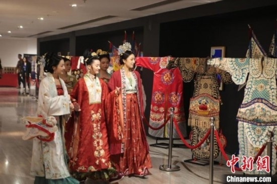 9月28日晚,第十四屆中華世紀(jì)壇中秋詩(shī)會(huì)在京舉行,圖為民眾身著漢服參觀京劇服裝。 主辦方供圖