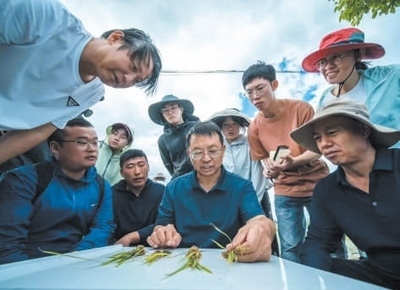 科技創(chuàng)新中國工程院院士張福鎖(中)和科技小院學(xué)生、農(nóng)民一起探討中稻種植技術(shù)。趙 渝攝(人民視覺)