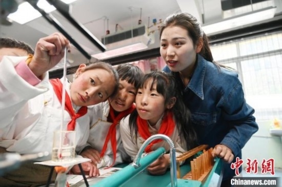 5月18日,四川阿壩州壤塘縣寄宿制學(xué)校學(xué)生在科學(xué)課做實驗。中新社記者 安源 攝