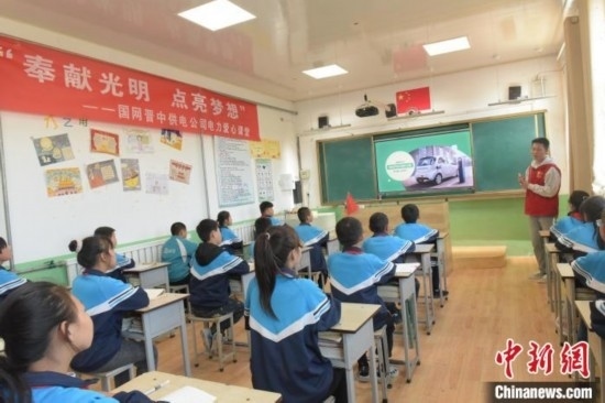 在國家電網(wǎng)“電力愛心教室”內(nèi),電力人員為鄉(xiāng)村兒童科普電力知識。展望攝