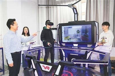 侯精明(左一)與研究生討論VR城市洪澇逃生體驗的演示情況。