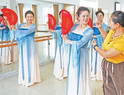 內蒙古自治區(qū)呼倫貝爾市扎蘭屯市老年活動中心,幾名學員在老年大學上舞蹈課。韓穎群攝(影像中國)