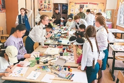 近日,黑龍江省黑河市第六小學(xué)教育集團(tuán)赴俄羅斯布拉戈維申斯克第六學(xué)校開展文化交流。交流期間,中國學(xué)生體驗了俄羅斯的課堂文化,雙方增進(jìn)了對彼此文化的了解;操場上,兩國學(xué)生載歌載舞,通過音樂和舞蹈進(jìn)一步加深了友誼。圖為中俄兩國學(xué)生一起繪畫。