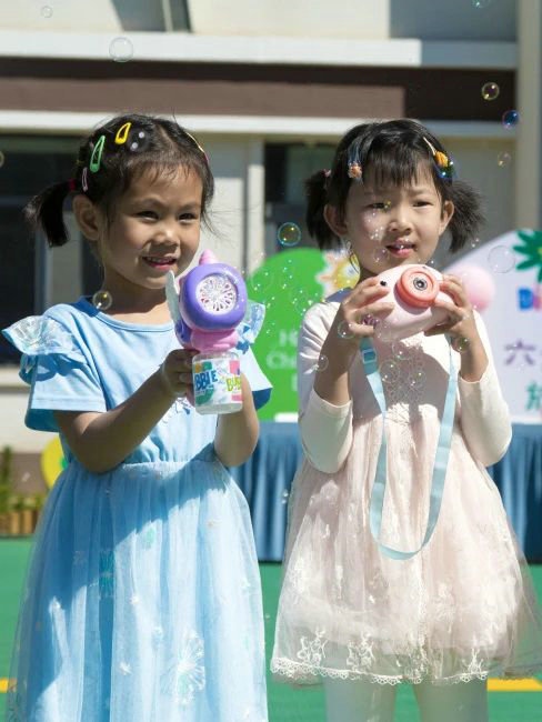 當日,打扮成迪士尼童話里人物的老師們與盛裝打扮的小朋友們,共同手持泡泡機,在晶瑩剔透的泡泡里一起沉浸在童話世界里。