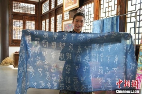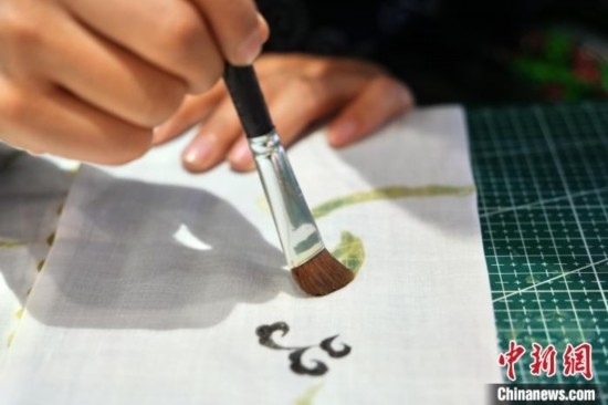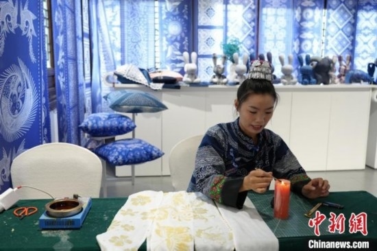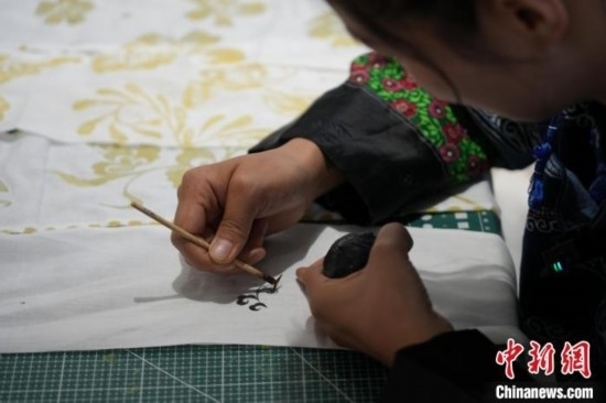 貴州織金苗族蠟染2021年6月入選國務(wù)院公布第五批國家級非物質(zhì)文化遺產(chǎn)代表性項目名錄。“95后”苗族女孩王秋雨大學(xué)畢業(yè)后回到織金,成為一名織金苗族蠟染推廣者。她不僅使用傳統(tǒng)小臘刀,還使用大臘刀和毛筆,以蜂蠟為墨在絲巾、衣服、箱包上繪制小篆、甲骨文、山水等文字與圖案,這些蠟染產(chǎn)品深受消費者喜愛。圖為6月19日,王秋雨在織金縣平遠(yuǎn)古鎮(zhèn)的依文織金數(shù)字化展廳制作蠟染。周燕玲 攝