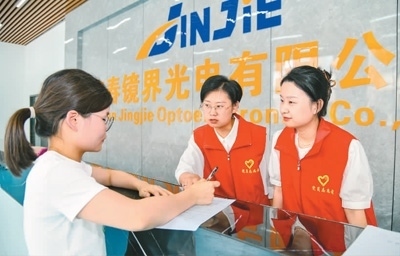 圖為近日,蒙山鎮(zhèn)黨員志愿者來到鏡界光電有限公司宣傳人才政策,指導(dǎo)企業(yè)申報(bào)相關(guān)人才項(xiàng)目。