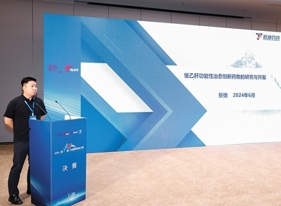 “慢乙肝功能性治愈創(chuàng)新藥物的研究與開發(fā)”項(xiàng)目負(fù)責(zé)人張弛在二〇二四(第十屆)中國(guó)海歸創(chuàng)業(yè)大賽決賽中。主辦方供圖