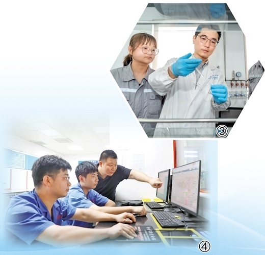 圖①:東港熱電公司博士創(chuàng)新站博士(左)與企業(yè)員工討論實驗反應結果。圖②:東港熱電公司員工(右)帶領參與博士創(chuàng)新站實踐工作的大學生檢修設備。