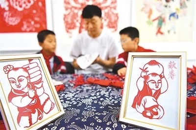 山東高密姜莊鎮(zhèn)產(chǎn)學(xué)研實踐基地內(nèi),非遺傳承人指導(dǎo)小朋友剪紙。李海濤攝(人民圖片)