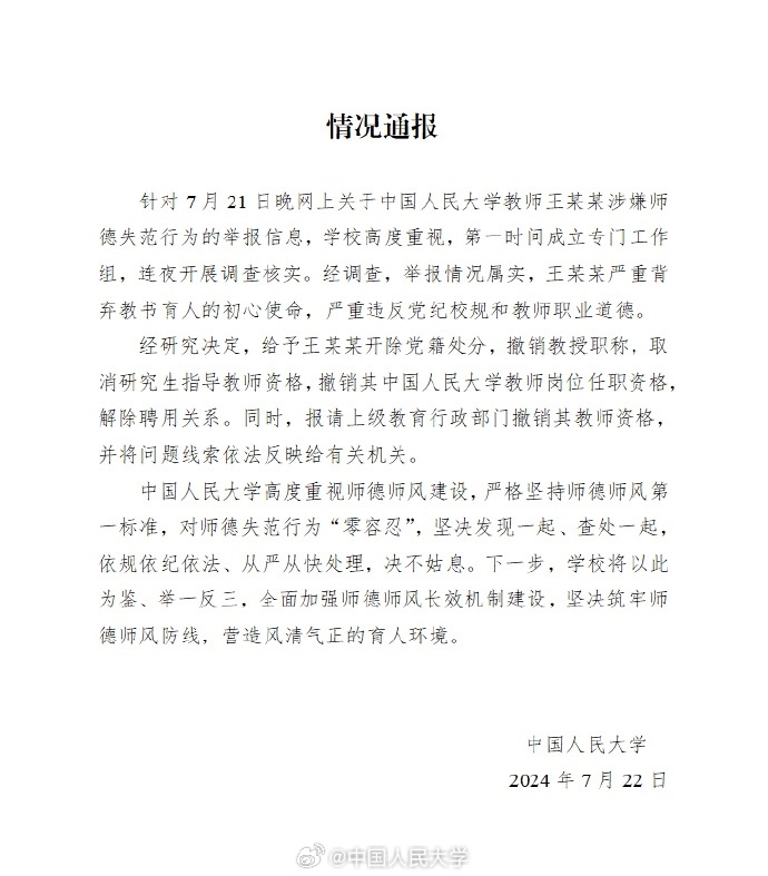 通報(bào)中稱,學(xué)校高度重視,第一時(shí)間成立專門工作組,連夜開展調(diào)查核實(shí)。經(jīng)研究決定,給予王某某開除黨籍處分,撤銷教授職稱,取消研究生指導(dǎo)教師資格,撤銷其中國人民大學(xué)教師崗位任職資格,解除聘用關(guān)系。同時(shí),報(bào)請上級教育行政部門撤銷其教師資格,并將問題線索依法反映給有關(guān)機(jī)關(guān)。