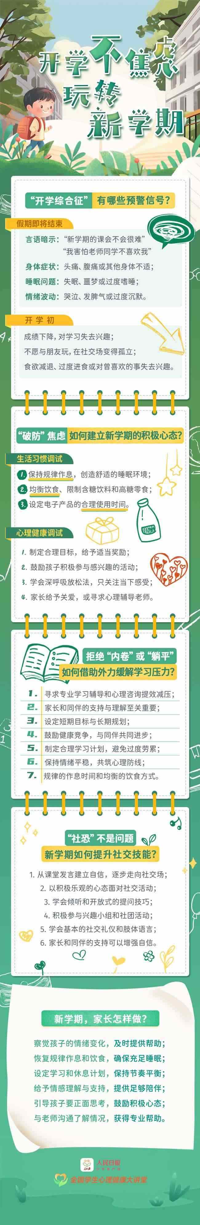 進(jìn)入開學(xué)倒計時,孩子出現(xiàn)情緒低落、身體不適,還常把“不想上學(xué)”掛在嘴邊……這些都是“開學(xué)綜合征”的預(yù)警信號。面對新學(xué)期的挑戰(zhàn),孩子如何調(diào)整心態(tài)?家長如何應(yīng)對?心理健康專家來支招,帶你玩轉(zhuǎn)新學(xué)期。