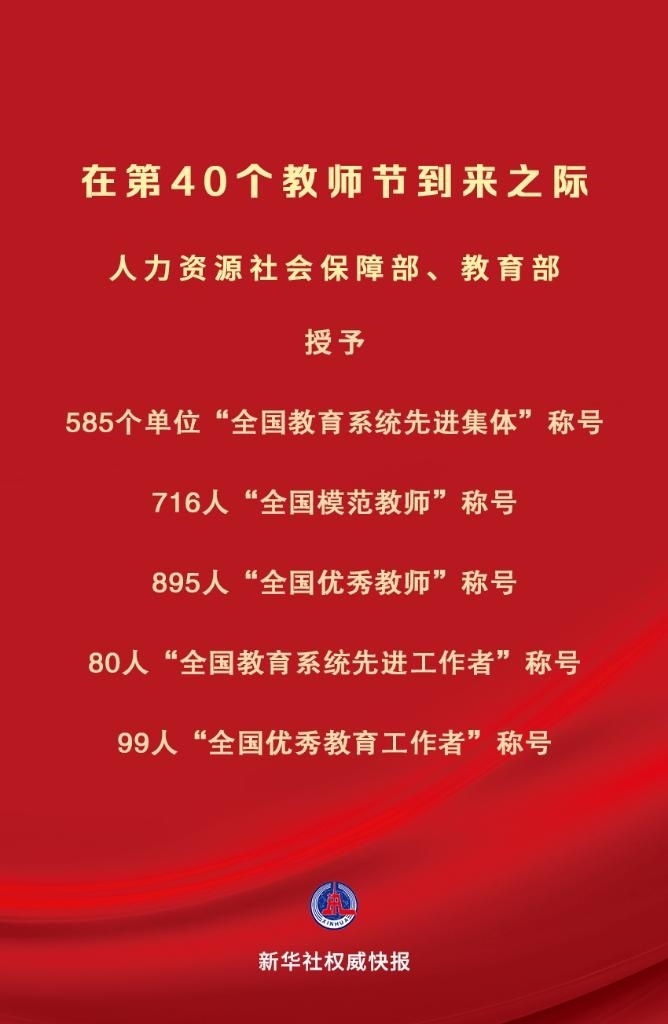 在中華人民共和國成立75周年和第40個(gè)教師節(jié)到來之際,為大力弘揚(yáng)教育家精神,營造全社會尊師重教濃厚氛圍,激勵(lì)全國廣大教師和教育工作者落實(shí)立德樹人根本任務(wù),積極投身教育強(qiáng)國建設(shè),人力資源社會保障部、教育部決定授予中央財(cái)經(jīng)大學(xué)金融學(xué)院等585個(gè)單位“全國教育系統(tǒng)先進(jìn)集體”稱號;授予刁榮春等716名同志“全國模范教師”稱號;授予于淵等895名同志“全國優(yōu)秀教師”稱號;授予王彥平等80名同志“全國教育系統(tǒng)先進(jìn)工作者”稱號;授予王軍等99名同志“全國優(yōu)秀教育工作者”稱號。