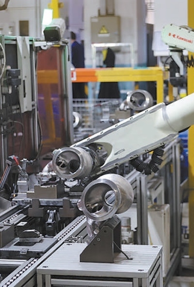 江蘇無(wú)錫職業(yè)技術(shù)學(xué)院教師團(tuán)隊(duì)為蠡湖增壓技術(shù)公司研發(fā)的殼體機(jī)器人自動(dòng)化去毛刺工作站正在作業(yè)。無(wú)錫職業(yè)技術(shù)學(xué)院黨委宣傳部供圖