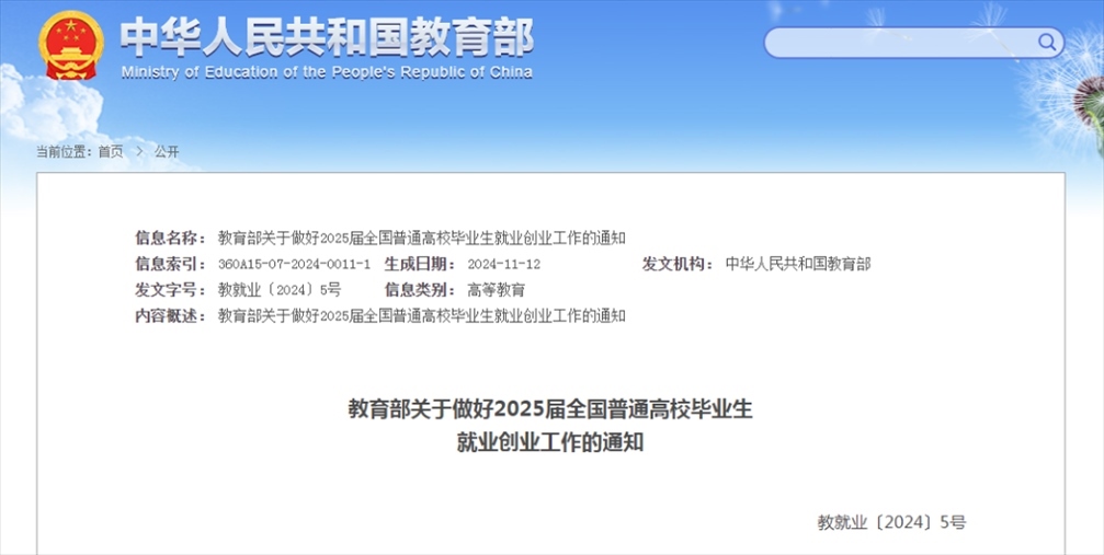記者11月13日從教育部獲悉,教育部近日印發(fā)通知,部署做好2025屆全國(guó)普通高校畢業(yè)生就業(yè)創(chuàng)業(yè)工作。通知提出實(shí)施2025屆全國(guó)普通高校畢業(yè)生就業(yè)創(chuàng)業(yè)促進(jìn)和服務(wù)體系建設(shè)行動(dòng),全力促進(jìn)高校畢業(yè)生高質(zhì)量充分就業(yè)。