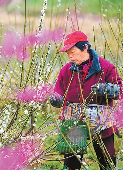 浙江省湖州市長興縣龍山街道的東方梅園內,梅農(nóng)正在采摘梅花,用于制作梅花香水、梅花精油等產(chǎn)品。