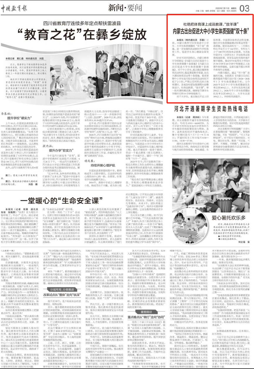2025年7月11日,《中國教育報(bào)》第3版刊發(fā)題為《杜絕把體育課上成說教課、“放羊課”內(nèi)蒙古出臺促進(jìn)大中小學(xué)生體質(zhì)強(qiáng)健“雙十條”》的文章,報(bào)道了內(nèi)蒙古教育廳印發(fā)促進(jìn)中小學(xué)生、大學(xué)生體質(zhì)強(qiáng)健的“雙十條”措施,進(jìn)一步加強(qiáng)和改進(jìn)新時(shí)代學(xué)校體育工作,促進(jìn)學(xué)生身心健康全面發(fā)展。