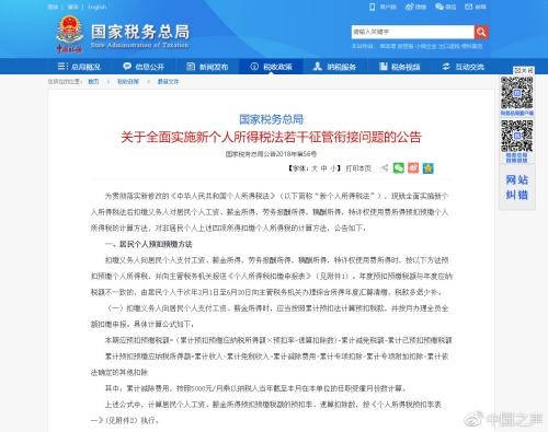 ​​  據(jù)中國(guó)之聲《新聞縱橫》報(bào)道:新修改的個(gè)人所得稅法將于2019年1月1日正式實(shí)施。國(guó)家稅務(wù)總局日前發(fā)布公告明確了全面實(shí)施新個(gè)人所得稅法的征管辦法,確保新舊稅制平穩(wěn)過渡。