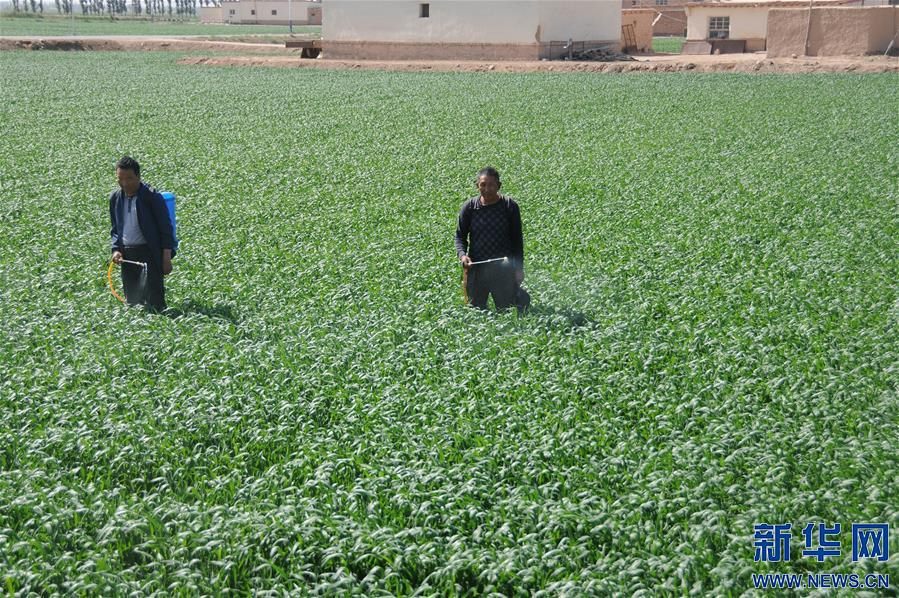 5月28日,內(nèi)蒙古巴彥淖爾市臨河區(qū)干召廟鎮(zhèn)棋盤村村民在麥田中噴藥防治病蟲害。新華社記者李云平攝