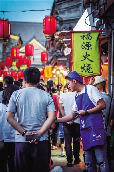 6月7日正值周日,夜幕還未降臨,大召廣場上已經(jīng)聚集了不少消遣的市民,他們當(dāng)中有六七十歲的老人,也有二三十歲的青年,還有牽著父母手的孩童。隨著時間的推移,廣場上的人越來越多,而緊挨著廣場的通順大巷更是人頭攢動,吆喝聲、叫賣聲、談笑聲、音樂聲混在一起,形成了夏季獨有的市井之聲。街上,從本地的稀果羹、羊肉串、烤面筋到北京爆肚、武漢臭豆腐可謂應(yīng)有盡有,家家戶戶的門前都或多或少的有市民排隊等候。