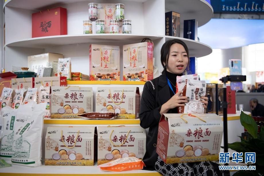 9月22日,一名參展商在位于山西省忻州市忻府區(qū)小檀村的雜糧產(chǎn)品展示展銷展廳內(nèi)進行直播銷售。新華社記者 楊晨光 攝
