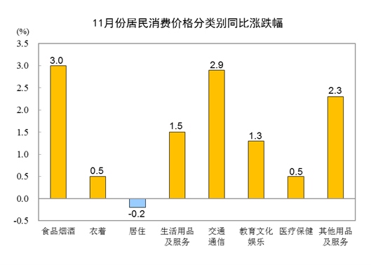 11月份,食品煙酒類價格同比上漲3.0%,影響CPI(居民消費價格指數(shù))上漲約0.85個百分點。食品中,畜肉類價格上漲17.6%,影響CPI上漲約0.56個百分點,其中豬肉價格上漲34.4%,影響CPI上漲約0.47個百分點;蛋類價格上漲9.9%,影響CPI上漲約0.07個百分點;鮮果價格上漲9.6%,影響CPI上漲約0.18個百分點;水產(chǎn)品價格上漲3.4%,影響CPI上漲約0.06個百分點;糧食價格上漲3.0%,影響CPI上漲約0.05個百分點;鮮菜價格下降21.2%,影響CPI下降約0.53個百分點。