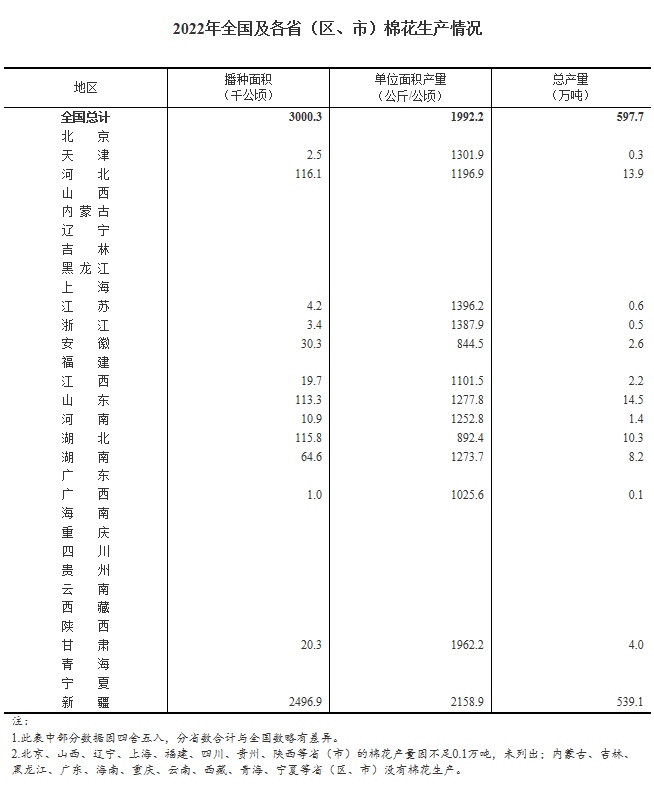 2022年,全國棉花產(chǎn)量597.7萬噸,比上年增加24.6萬噸,增長4.3%。其中新疆棉花產(chǎn)量539.1萬噸,比上年增加26.2萬噸,增長5.1%,占全國總量的90.2%,比上年提高0.7個百分點;長江流域棉區(qū)產(chǎn)量23.9萬噸,比上年減少0.5萬噸,下降2.0%;黃河流域棉區(qū)產(chǎn)量30.1萬噸,比上年減少1.8萬噸,下降5.6%。