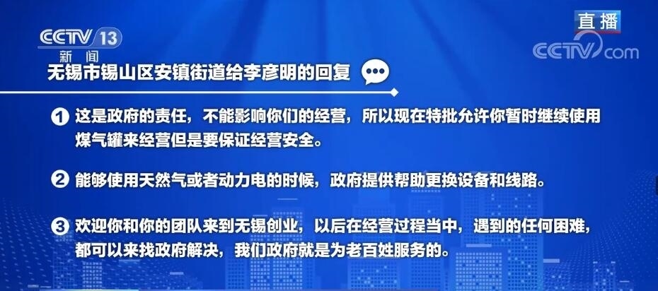 白巖松:首先我們來看看安鎮(zhèn)街道給李彥明的回復(fù)當(dāng)中的一些關(guān)鍵詞,第一個,這是政府的責(zé)任,不能影響你們的經(jīng)營。第二個里頭包括能夠使用天然氣或者動力電的時候,政府提供幫助更換設(shè)備和線路。在第三里頭有我們政府就是為老百姓服務(wù)的。咱們接下來馬上連線一下當(dāng)事人,無錫市錫山區(qū)安鎮(zhèn)街道商務(wù)科的科長鄒祎,就是他幫著辦的這個事情。鄒科長您好!您當(dāng)然感受得到您火了,在網(wǎng)上也被網(wǎng)友表揚(yáng),我特別想知道您的領(lǐng)導(dǎo)表揚(yáng)您沒有?