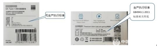 5.46款樣品有36款明示了生產(chǎn)執(zhí)行標(biāo)準(zhǔn),10款未明示生產(chǎn)執(zhí)行標(biāo)準(zhǔn)。明示的標(biāo)準(zhǔn)絕大多數(shù)為企業(yè)標(biāo)準(zhǔn),少數(shù)為已過(guò)時(shí)效期的行業(yè)標(biāo)準(zhǔn),或與數(shù)據(jù)線產(chǎn)品無(wú)相關(guān)性的安全標(biāo)準(zhǔn)。