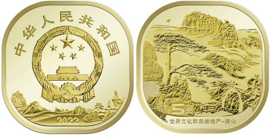 世界文化和自然遺產(chǎn)——黃山普通紀(jì)念幣正面圖案為中華人民共和國(guó)國(guó)徽,國(guó)徽上方刊“中華人民共和國(guó)”國(guó)名,下方為裝飾風(fēng)格的黃山圖案并刊年號(hào)“2022”字樣;背面主景圖案為迎客松和黃山山峰等,主景圖案下方刊“世界文化和自然遺產(chǎn)——黃山”字樣和面額“5元”字樣。
