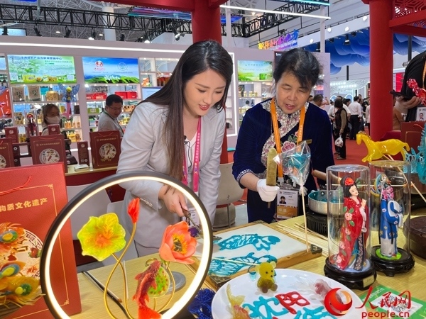 “我們的糖人制作技藝興于清朝道光年間,技法分為吹、塑、畫。結合消費新需求,我們推出了一些新產(chǎn)品,很受年輕人喜歡。在消博會上,通過展示糖人技藝,讓更多的消費者了解傳統(tǒng)文化,喜歡上我們的作品?!鄙蜿柪钍咸侨酥谱骷妓嚨谖宕鷤鞒腥死铠P艷表示。