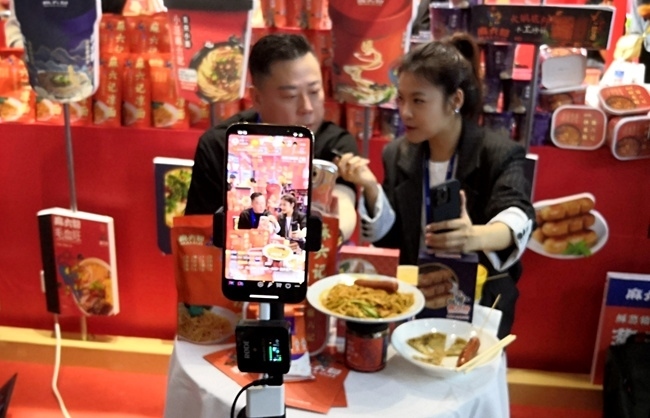 展館內(nèi)開(kāi)啟了直播帶貨。人民網(wǎng)記者 孫博洋攝