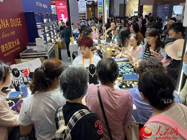 參觀者在第三屆消博會(huì)現(xiàn)場(chǎng)參觀展品。人民網(wǎng)記者 魏青成攝