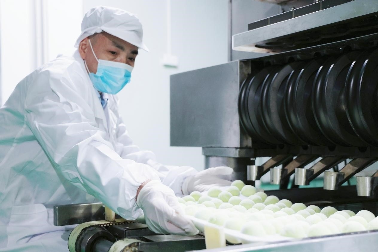 在無(wú)錫孫府食品有限公司生產(chǎn)車間,工人正在制作青團(tuán)。受訪者供圖