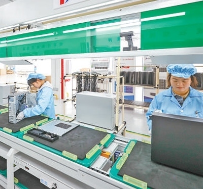 工人在畢節(jié)一家計(jì)算機(jī)生產(chǎn)企業(yè)產(chǎn)線上組裝產(chǎn)品。陳 曦?cái)z(人民視覺)