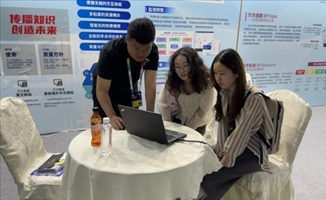 萬方數(shù)據(jù)工作人員現(xiàn)場為用戶進行產品演示。(受訪者供圖)