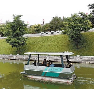 游客在西安護(hù)城河乘坐自動(dòng)駕駛游船游覽。 本報(bào)記者 原韜雄攝