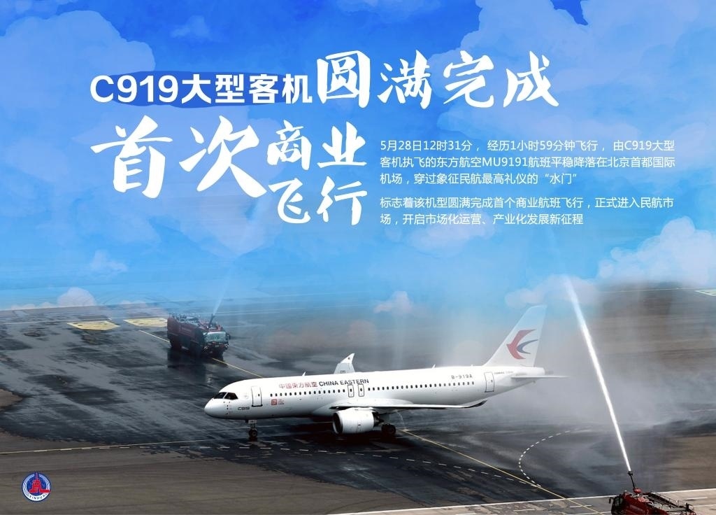5月28日12時(shí)31分,經(jīng)歷1小時(shí)59分鐘飛行,由C919大型客機(jī)執(zhí)飛的東方航空MU9191航班平穩(wěn)降落在北京首都國際機(jī)場,穿過象征民航最高禮儀的“水門”,標(biāo)志著該機(jī)型圓滿完成首個(gè)商業(yè)航班飛行,正式進(jìn)入民航市場,開啟市場化運(yùn)營、產(chǎn)業(yè)化發(fā)展新征程。新華社發(fā)