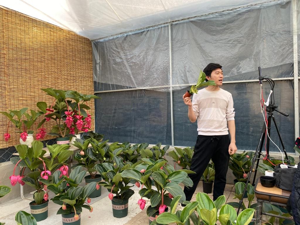 李莎莎的花卉大棚內,主播正在直播銷售寶蓮燈花。新華社記者 陳國峰 攝
