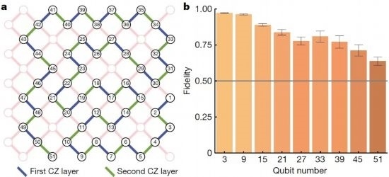 利用“祖沖之二號”完成的51比特一維簇態(tài)制備的線路及量子態(tài)保真度結(jié)果。(研究團隊供圖)