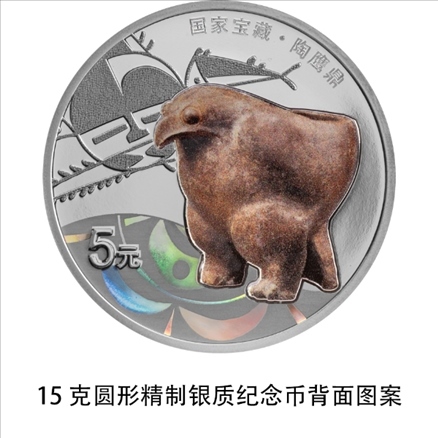 15克圓形銀質(zhì)紀(jì)念幣背面圖案為陶鷹鼎造型,襯以仰韶文化相關(guān)紋飾,并刊“國家寶藏·陶鷹鼎”字樣及面額。