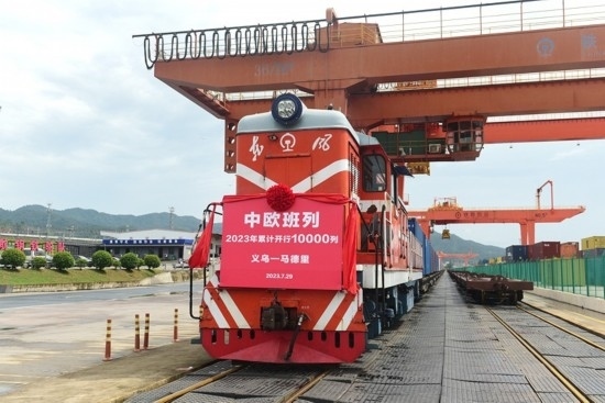 7月29日,隨著滿載110個標(biāo)箱出口貨物的X8020次中歐班列從鐵路義烏西站緩緩開出前往西班牙馬德里,2023年中歐班列累計開行已達1萬列,較去年提前22天破萬列;發(fā)送貨物108.3萬標(biāo)準(zhǔn)箱,同比增長27%。