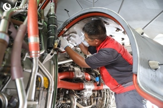 技術(shù)人員對飛機(jī)進(jìn)行維修。 人民網(wǎng)記者 孟凡盛攝
