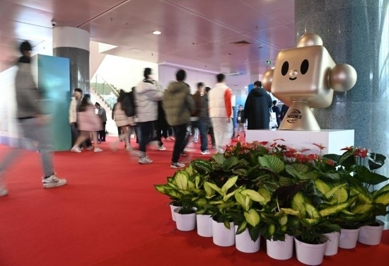 11月29日,鏈博會(huì)展廳入口處擺放著帶有“鏈氪”形象的小花壇引導(dǎo)觀展人群。