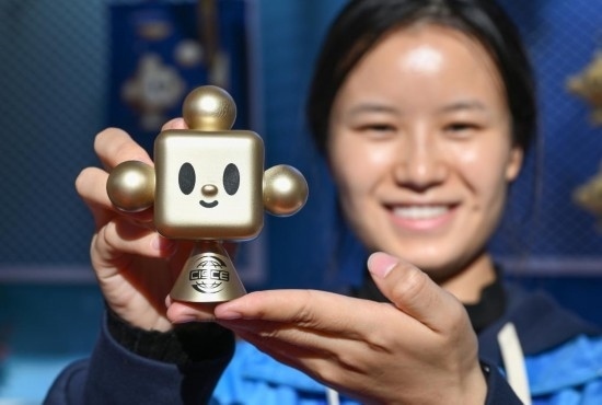11月29日,在鏈博會(huì)文創(chuàng)小店服務(wù)的志愿者向記者展示 “鏈氪”玩具手辦。